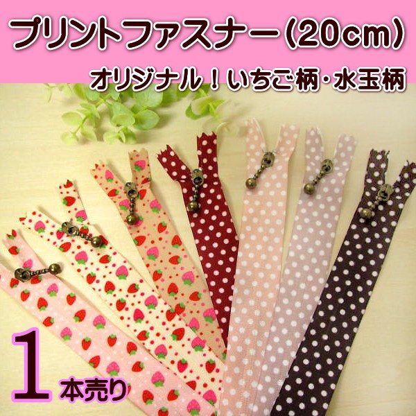 フェアリーレースオリジナル!いちご柄 水玉柄のプリントファスナー。