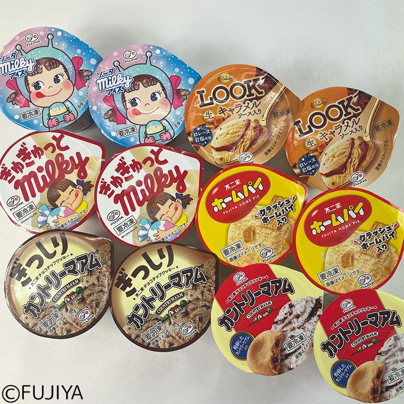 不二家の人気菓子「カントリーマアム」「ホームパイ」「ミルキー」「ルック」のカップアイスをたっぷり12個も詰め合わせました!