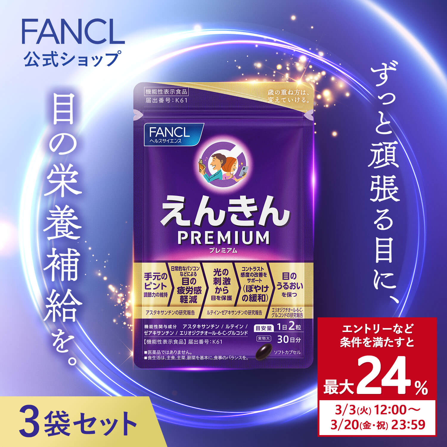 目に必要な3つの栄養(アスタキサンチン・ルテイン・ゼアキサンチン)とプレミアムならではの成分(エリオジクチオール-6-C-グルコシド)を配合。手元のピント調節力、ぼやけの緩和、光の刺激から目を保護、目の疲労感の軽減※に加え、目のうるおいにも働きかけ、お悩みに多角的にアプローチする、ファンケルアイケアサプリメント史上最高峰の商品。