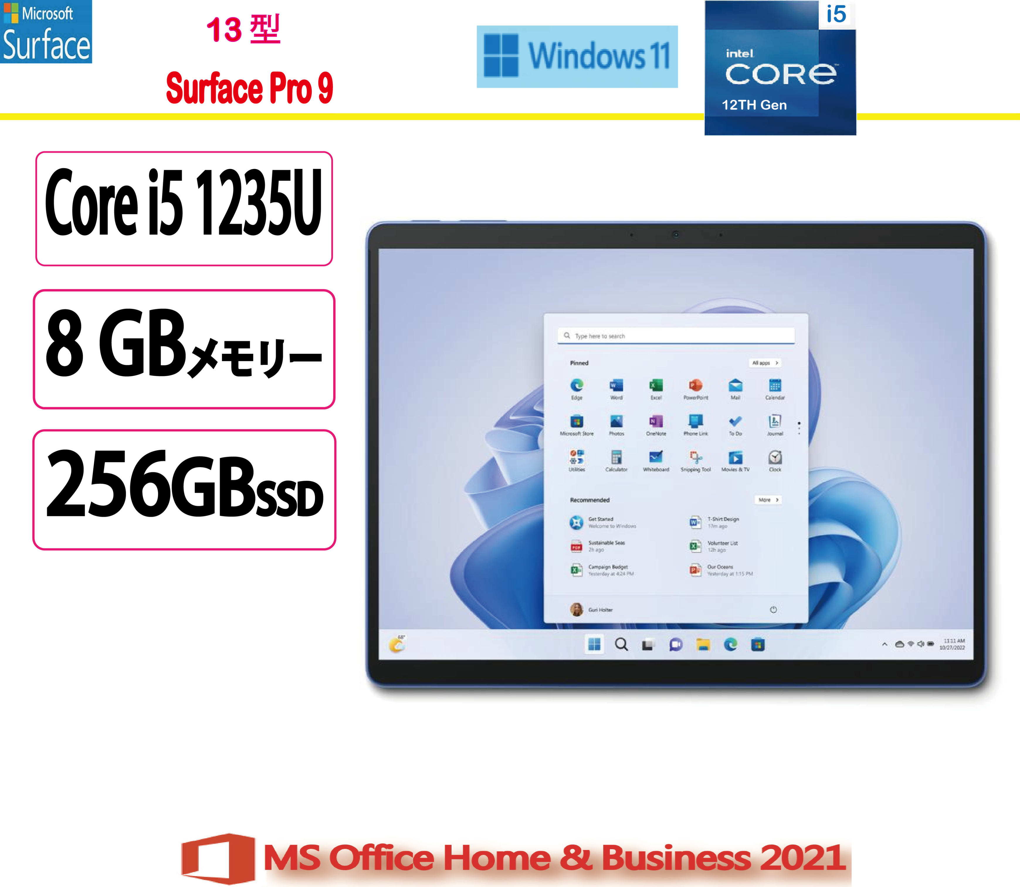 Intel Core i5-1235U プロセッサーを搭載したタブレットPC(メモリー8GB/SSD 256GB)。実質エッジツーエッジの13型PixelSense タッチスクリーンを採用。