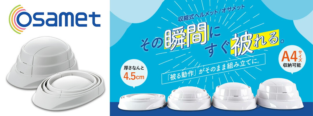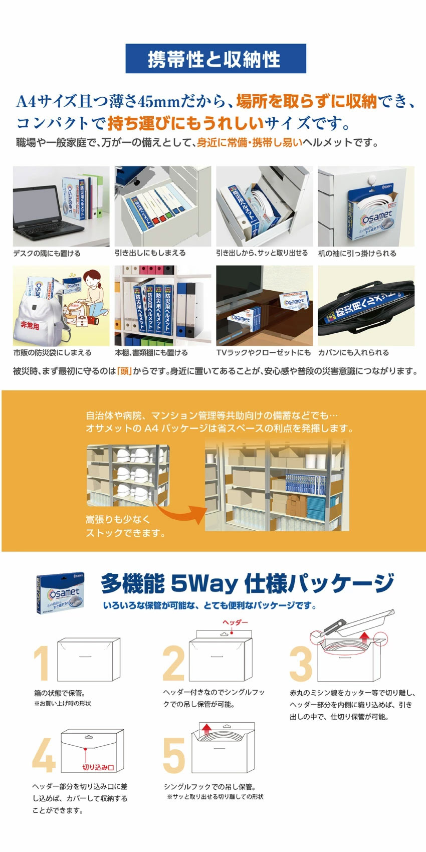 | 商品説明 | グッドデザイン賞受賞!折り畳めるのにすぐ被れる日本製の折りたたみ防災用ヘルメット『オサメット』。 地震や台風、ゲリラ豪雨、洪水、火山の噴火などの災害時に備えて必要不可欠な防災ヘルメット。「防災用品はかさばりやすく、場所を取る」そんなお悩みをオサメットが解決します。 A4サイズ薄さ45mm、いろいろな保管が可能な多機能仕様パッケージで場所を取らずに収納可能! ご家庭用はもちろん、店舗、事務所、オフィスなどの災害対策、自治体や病院、マンション管理など共助向けの備蓄などでも省スペースの利点を発揮します。 衝撃吸収も優秀で、国家検定にも合格した高い安全性はもちろん、収納性、携帯性、機能性、機動性を兼ね備えています。 子どもから大人まで簡単に扱えるのが嬉しい防災グッズの必需品。テレビや雑誌にも取り上げられる、今話題の商品です。 |