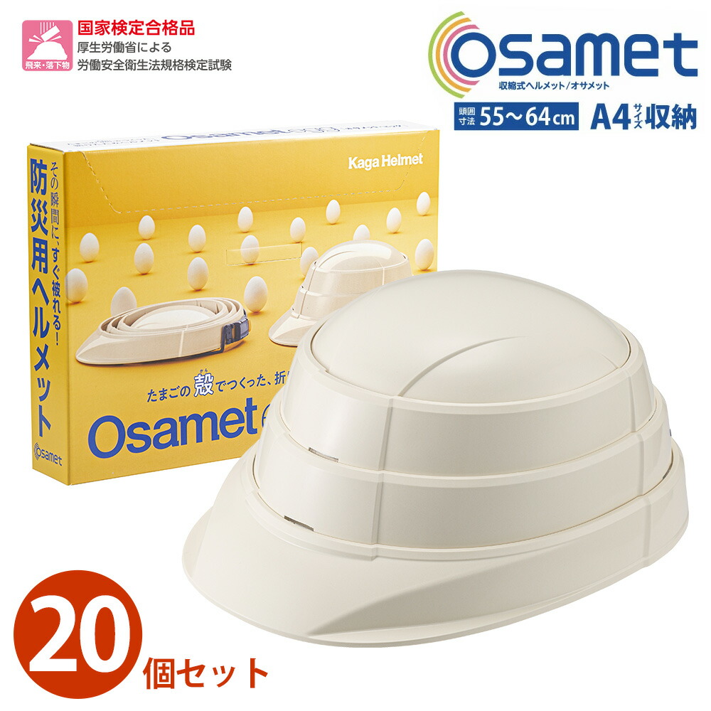 | 商品説明 | 折りたたみヘルメット「オサメット」の良さはそのまま、卵の殻を20%使用した環境にやさしいヘルメットが登場! 地震や台風、ゲリラ豪雨、洪水、火山の噴火などの災害時に備えて必要不可欠な防災ヘルメット。「防災用品はかさばりやすく、場所を取る」そんなお悩みをオサメットが解決します。 A4サイズ薄さ45mm、いろいろな保管が可能な多機能仕様パッケージで場所を取らずに収納可能! ご家庭用はもちろん、店舗、事務所、オフィスなどの災害対策、自治体や病院、マンション管理など共助向けの備蓄などでも省スペースの利点を発揮します。 衝撃吸収も優秀で、国家検定にも合格した高い安全性はもちろん、収納性、携帯性、機能性、機動性を兼ね備えています。 子どもから大人まで簡単に扱えるのが嬉しい防災グッズの必需品。テレビや雑誌にも取り上げられる、今話題の商品です。 |