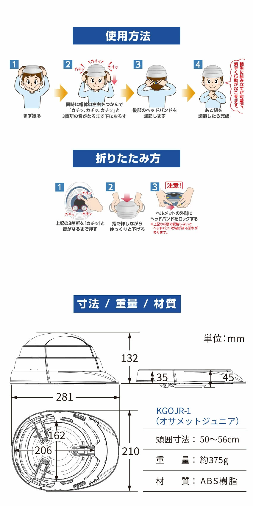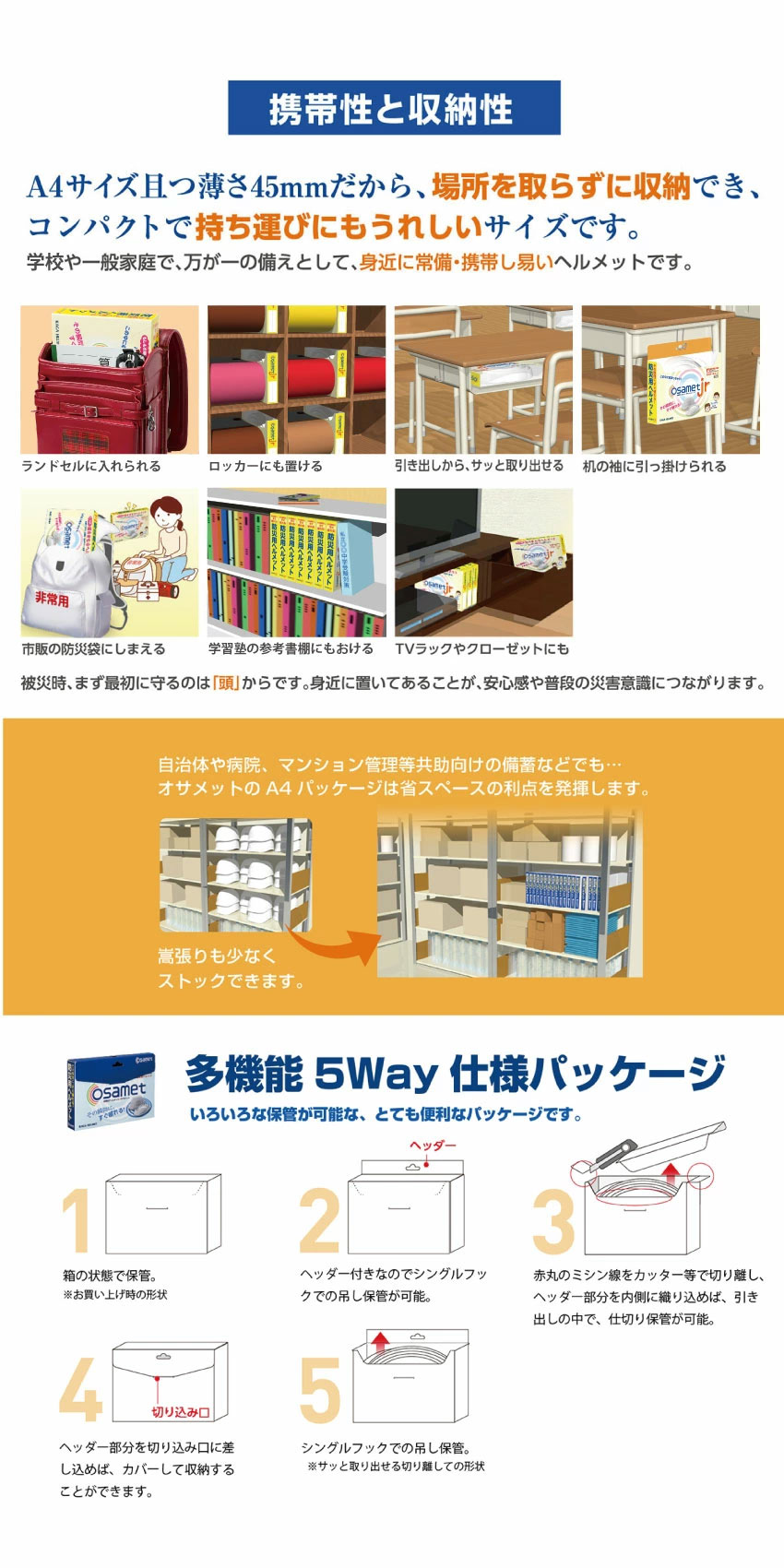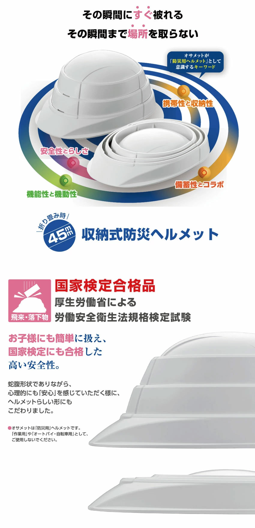 | 商品説明 | グッドデザイン賞2018受賞の国家検定合格品!折り畳み防災用ヘルメット収縮式A4サイズ『オサメット』の未就学児から使える子供用サイズ。 地震や台風、ゲリラ豪雨、洪水、火山の噴火などの災害時に備えて必要不可欠な防災ヘルメット。「防災用品はかさばりやすく、場所を取る」そんなお悩みをオサメットが解決します。 A4サイズ薄さ45mm、いろいろな保管が可能な多機能仕様パッケージで場所を取らずに収納可能!ランドセルやロッカーにも入ります♪ ご家庭用はもちろん、保育園や幼稚園、小学校の災害対策、自治体や病院、マンション管理など共助向けの備蓄などでも省スペースの利点を発揮します。 衝撃吸収も優秀で、国家検定にも合格した高い安全性はもちろん、収納性、携帯性、機能性、機動性を兼ね備えています。 子どもから大人まで簡単に扱えるのが嬉しい防災グッズの必需品。テレビや雑誌にも取り上げられる、今話題の商品です。 |