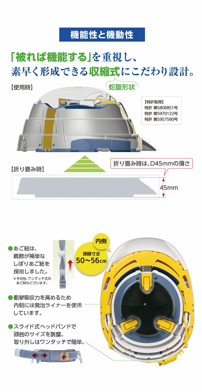 労働安全衛生法規格検定による飛来・落下試験も取得した折り畳み可能な防災用ヘルメットです。