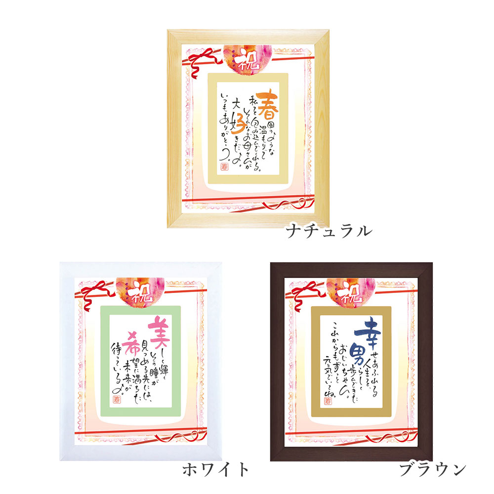 | 商品説明 | 「祝」の文字にさりげなく飾られたリボン&レース。お一人のお名前で綴るはがきタイプのポエムを、温かみのあるデザインフレームで装飾した『祝〜iwai〜』。壁掛け、スタンドのどちらも対応した、飾りやすいサイズ感。フレームカラーはお好みのものをお選び下さい。 入学・進学・卒業のお祝いや、成人式、就職・昇任祝い、定年退職、還暦・古希・米寿・白寿など長寿のお祝いや誕生日プレゼントなど、様々なお祝いギフトとしてお贈りいただけます。 ネームインポエムとは、そのフレーズ通り、名前を織り込んで作るポエムのことです。専属の作家がお名前と用途から作詩して丁寧に綴るポエムは、想いの伝わる、世界に一つだけの作品となります。 1人用はがきタイプの同シリーズには、キッズ向けや、シンプルなデザインもご用意しております。 |