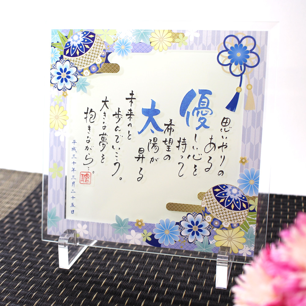 | 商品説明 | ブルーを基調に明るい雰囲気の和柄で可愛らしさをイメージした名前入りポエムです。小さいサイズなのに存在感溢れるデザイン。透明感あるガラスプレートは飾る場所を選ばずインテリアとしても◎アクリルのスタンドが付属されているのでお好きな所へ飾れます。 命名、誕生の記念や出産祝い、入園・入学・進学・卒業や七五三の記念、子どもの日のプレゼント、節句の名前旗の代わりに、などお子様プレゼントはもちろん、おじいちゃんおばあちゃんへの還暦や米寿、喜寿などの長寿のお祝いギフトとしてもお贈りいただけます。 ネームインポエムとは、そのフレーズ通り、名前を織り込んで作るポエムのことです。専属の作家がお名前と用途から作詩して丁寧に綴るポエムは、想いの伝わる、世界に一つだけの作品となります。 |