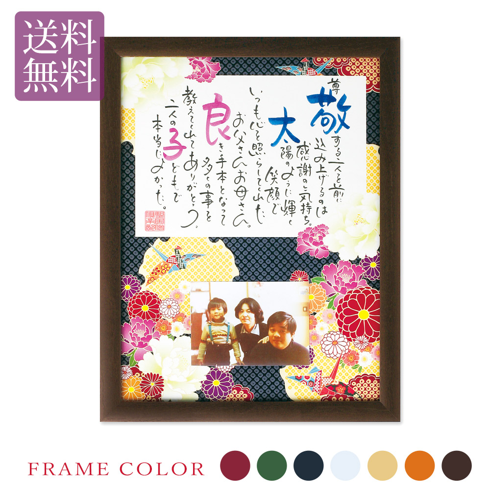 | 商品説明 | ネームインポエムとは、そのフレーズ通り、名前を織り込んで作るポエムのことです。専属の作家がお名前と用途から作詩して丁寧に綴るポエムは、想いの伝わる、世界に一つだけの作品となります。 伝統的な和柄「牡丹」「菊」「鶴」で彩られたシックで落ち着いたデザイン。 和装式のウェルカムボードや両親へのプレゼント、金婚式、銀婚式、退職祝い、還暦・古希・米寿・白寿など長寿のお祝いや、お世話になった方へのお礼、命名、お子様の誕生記念、出産祝いなど様々なギフトにご利用いただけます。 フレームカラーは「赤、緑、濃紺、白、木目、橙、茶」の全7色からお選び下さい。 |
