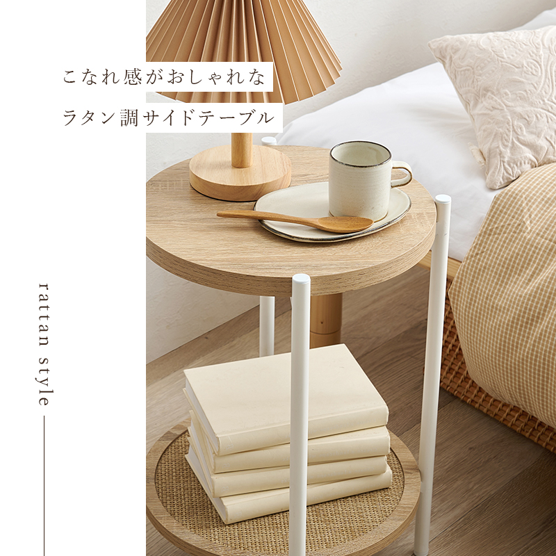 ラタン調の編み目で仕上げた棚板がアクセントとなり、おしゃれなサイドテーブル。