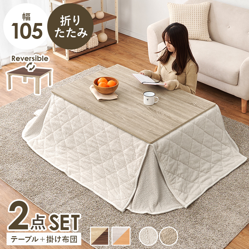 折りたたみ こたつ こたつ掛け布団 2点セット テーブル 長方形 105x75cm 折れ脚 ローテーブル 天板 リバーシブル 木目 木製 コンパクト 洗濯可能 敬老の日