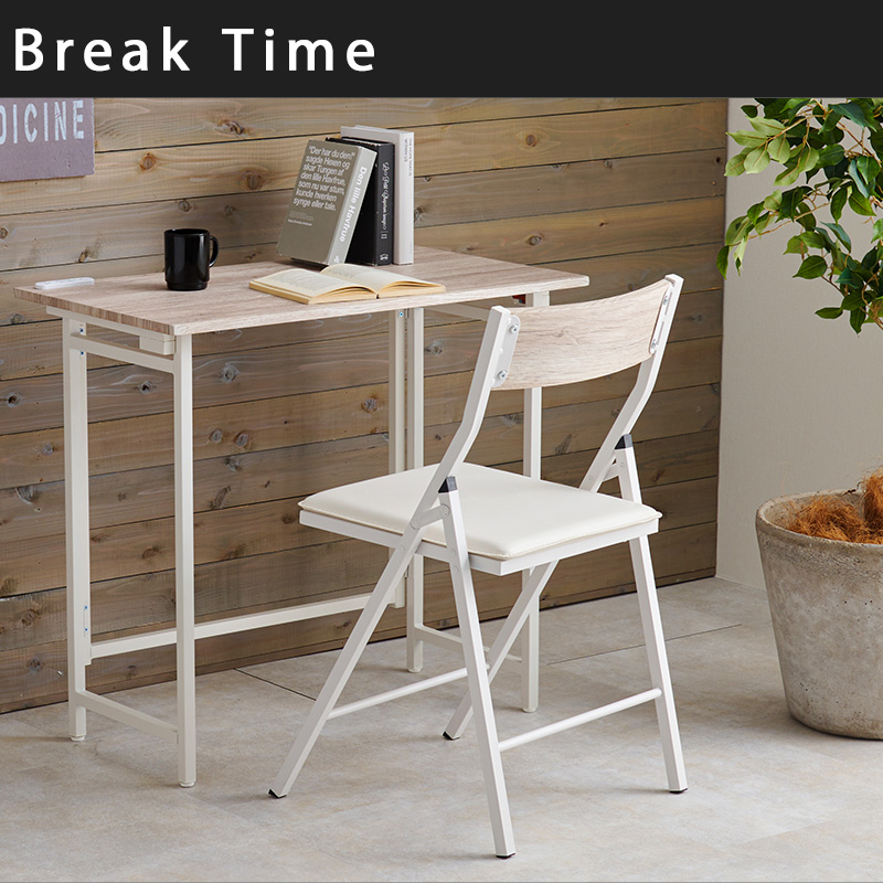 必要な時だけ広げて、たたんで収納できるデスクチェアセット。天板にコンセントがついていてパソコン作業にも便利。