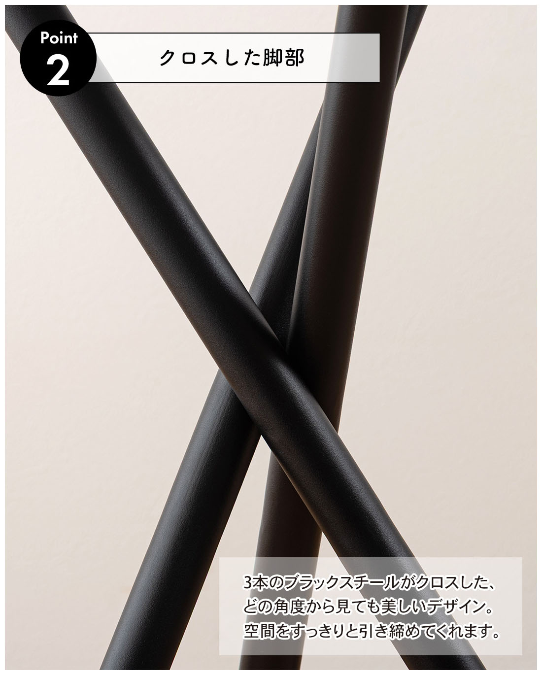 ●クロスした3本のブラックスチール脚がスタイリッシュなラウンドテーブル。