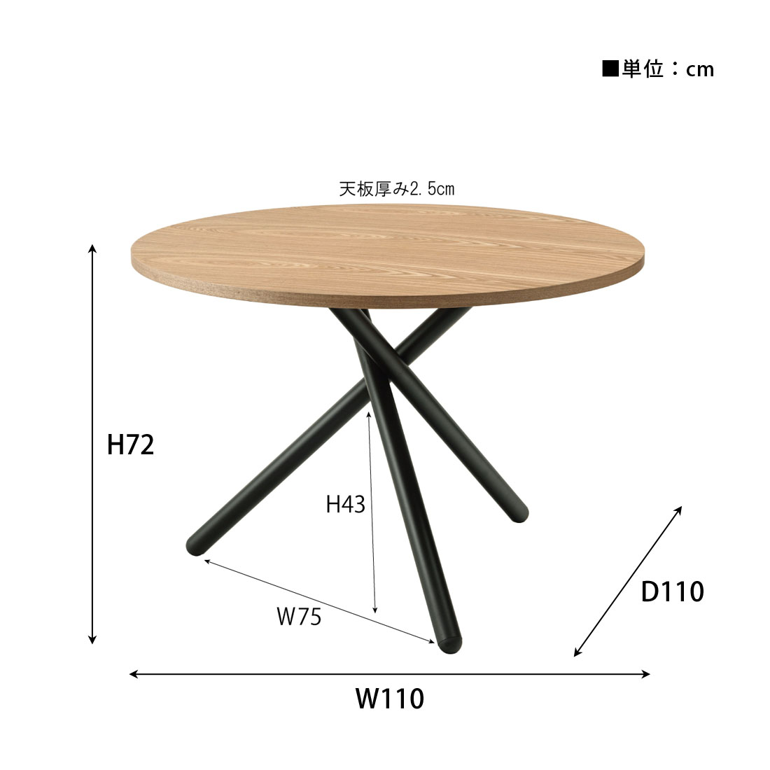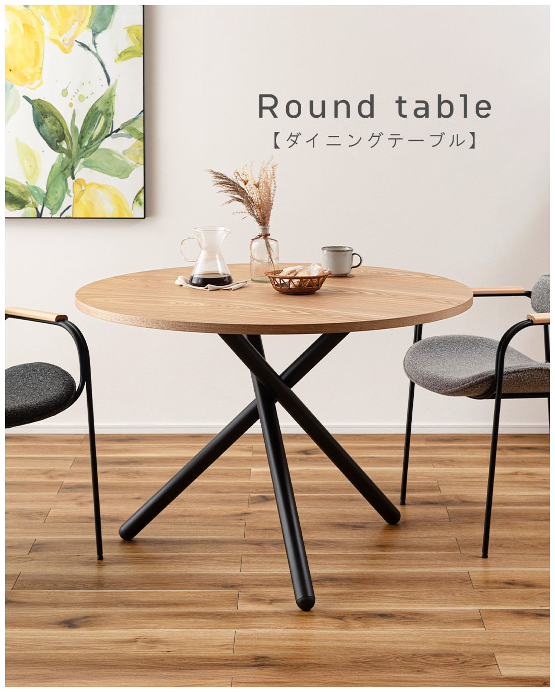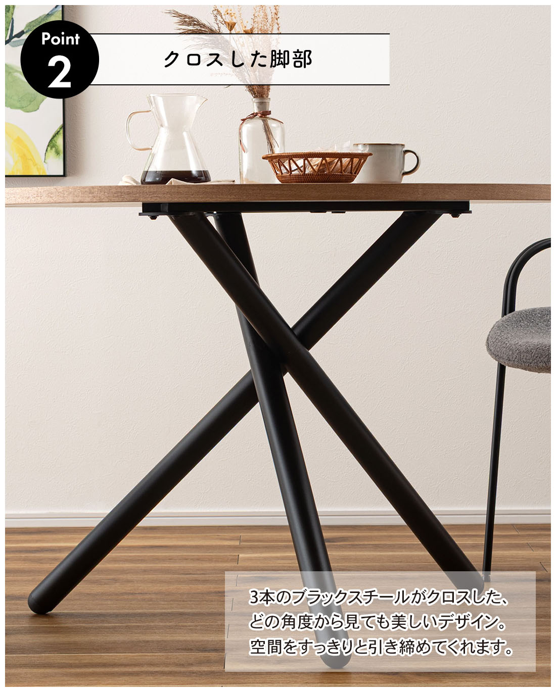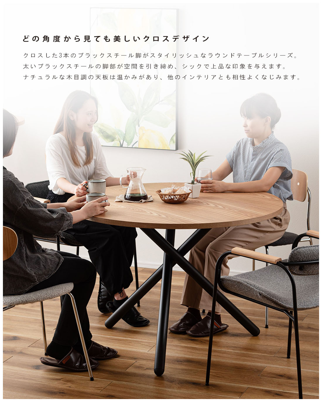 ●クロスした3本のブラックスチール脚がスタイリッシュなラウンドテーブル。