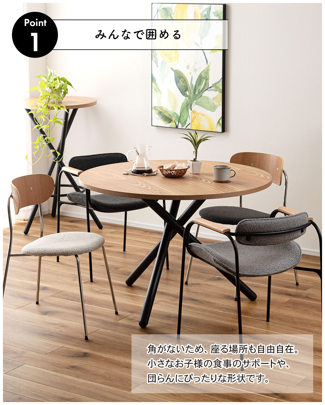 ●角がないため座る場所も自由自在。小さなお子様の食事のサポートや、団らんにぴったりな形状。