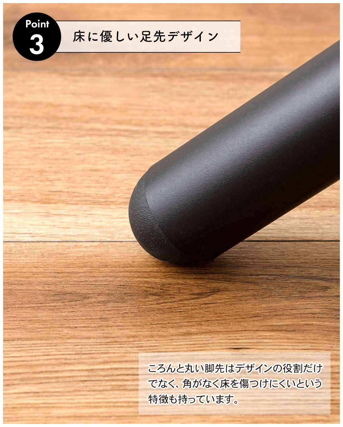 ●ころんと丸い足先はデザインの役割だけでなく、角がなく床を傷付けにくいという特徴も持っています。