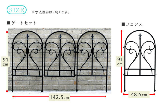 | ■サイズ | ゲートセット:幅 約1425×高さ 約910×厚さ 約15mm フェンス1枚:幅 約485×高さ 約910×厚さ 約15mm ※地中埋め込み部分 約200mm |