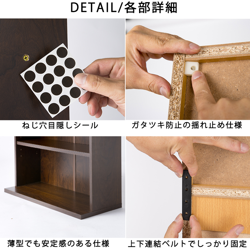 可動棚板は3cm間隔で高さ調整可。漫画本や文庫本だけでなく、CDやDVD、ゲームソフトなどの保管にも。また洗面所やキッチン、オフィスでの資料ファイルの収納など幅広く活躍。板材1枚が軽いため、お子様や女性の方でも30分ほどで組立可能。同梱の固定樹脂で上下の固定補強と壁との転倒防止で安全。 ポイント利用