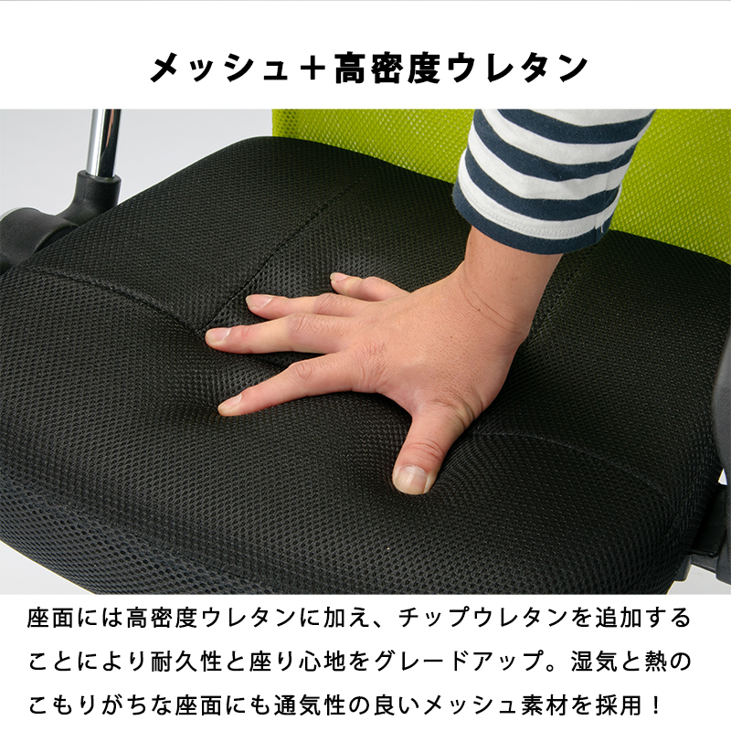 背もたれ・座椅子はメッシュタイプでフィット感があり長時間のデスクワークも安心。
