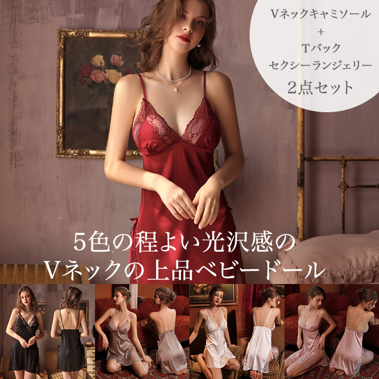 程よい光沢感のVネックキャミソールとTバックのセクシーランジェリー2点セットです。