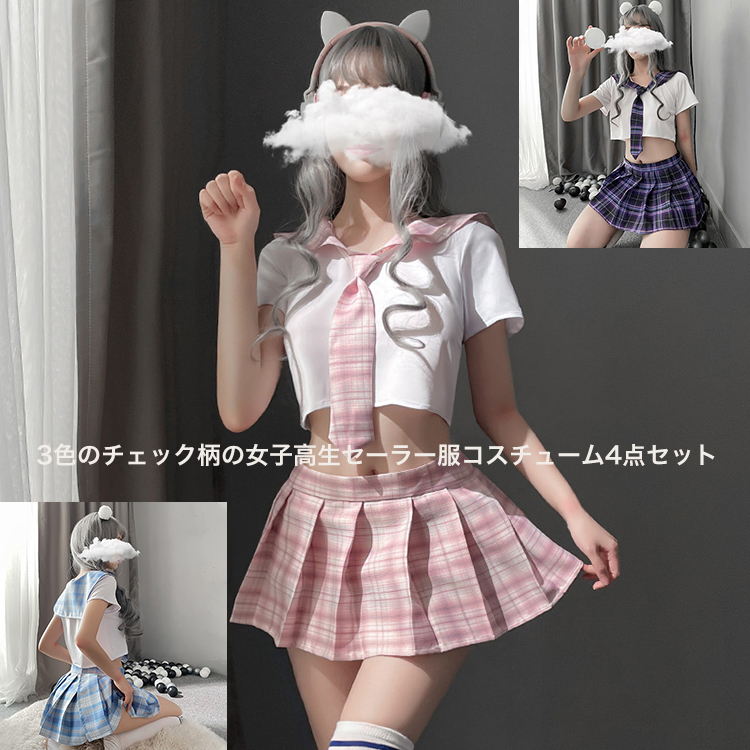 セクシー コスプレ セーラー服 学生制服 コスチューム 4点セット 女子校生 女子高生 ミニスカ制服 仮装 チェック柄 ミニスカート マイクロミニ丈 3色 爆買