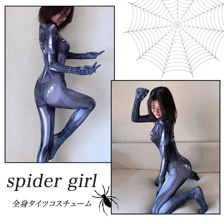 光沢感のある素材がボディーラインをセクシーに魅せるスパイダーガールの全身タイツコスチュームです。