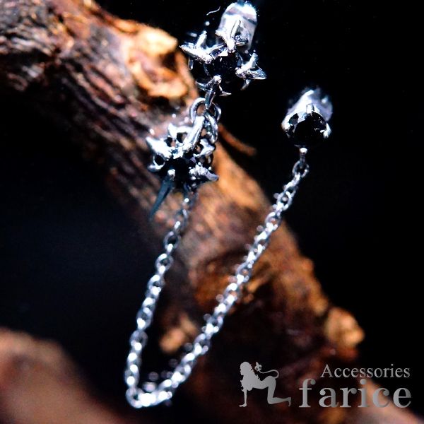 ブラックキュービックジルコニア3ポイント装飾 百合の爪&クロス型ソード石留め装飾 ロングチェーン連結 メンズ ステンレス316L 2ホール片耳ピアス