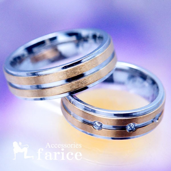 イエローゴールド2ライン・バイカラーデザイン 3クリアキュービックジルコニア装飾 ステンレス ペアリング「石無しor石付き/個別売り」