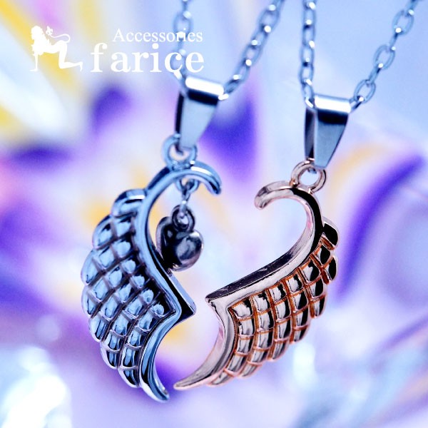 「二人で1つのハートインハート」エンジェルフェザー(天使の羽)デザイン ステンレス ペアネックレス「イエローゴールドorシルバー/個別売り」