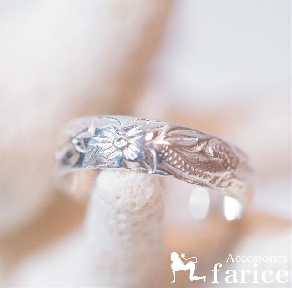 ★商品のコメント★ プルメリア&スクロールの中で最もベーシックなデザインの彫り模様が入ったハワイアンジュエリーシルバーリングです。ハワイアンジュエリー特有の美しい彫り模様は、ホワイトロジウムの真っ白な輝きによってより華やいだ雰囲気が出ていますね。“ハワイに咲く可憐な白い花”と呼ばれ『大切な人の幸せを願う者』など、様々な意味を持つプルメリアと、『幸せを運ぶ美しい波・永遠の愛』の意味を持つスクロールがひとつになった、人気定番のハワイアンジュエリー・トゥリングです。