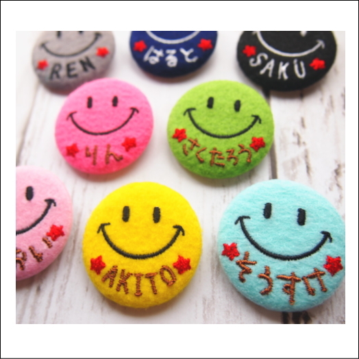 商品名:【中】スマイルにこちゃんのお名前刺繍缶バッジ【セミオーダー】