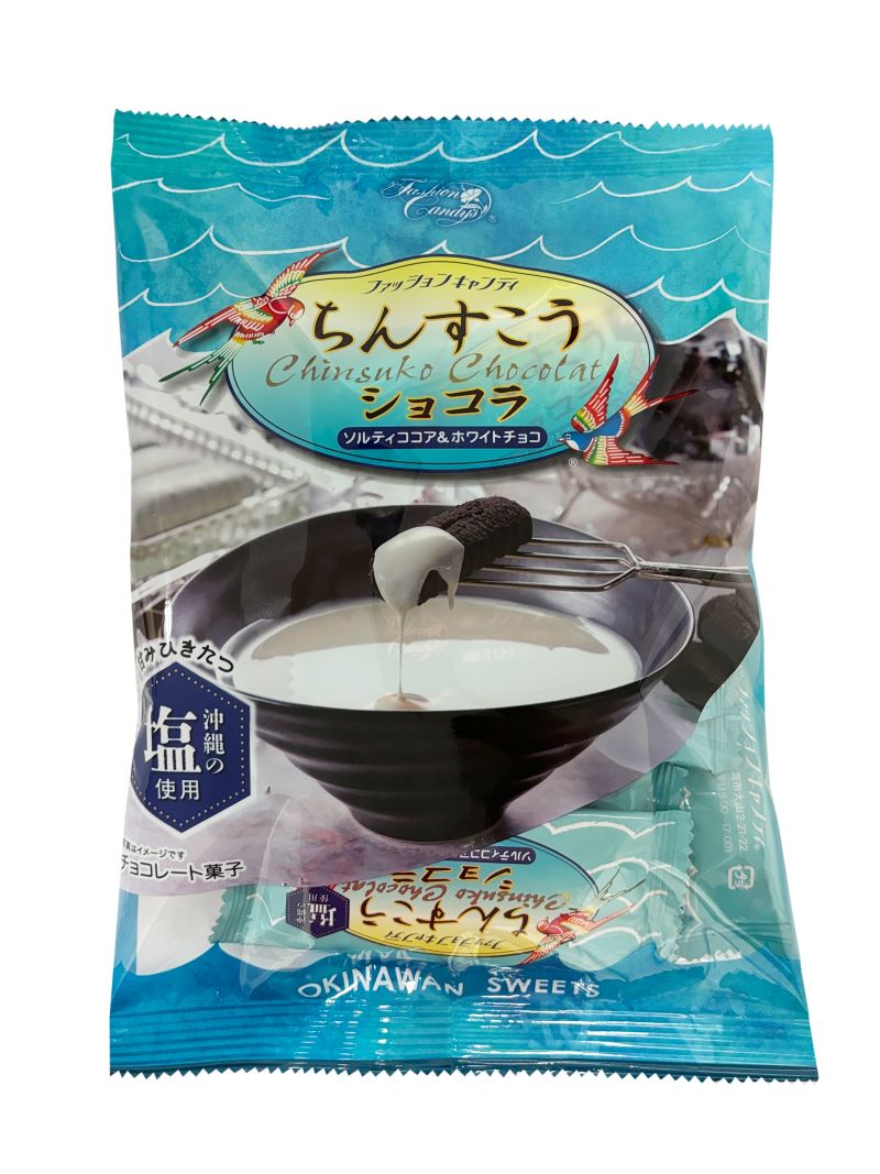 石垣の塩がアクセントのブラックココアちんすこうを、口溶けの良いホワイトチョコレートでコーティング。