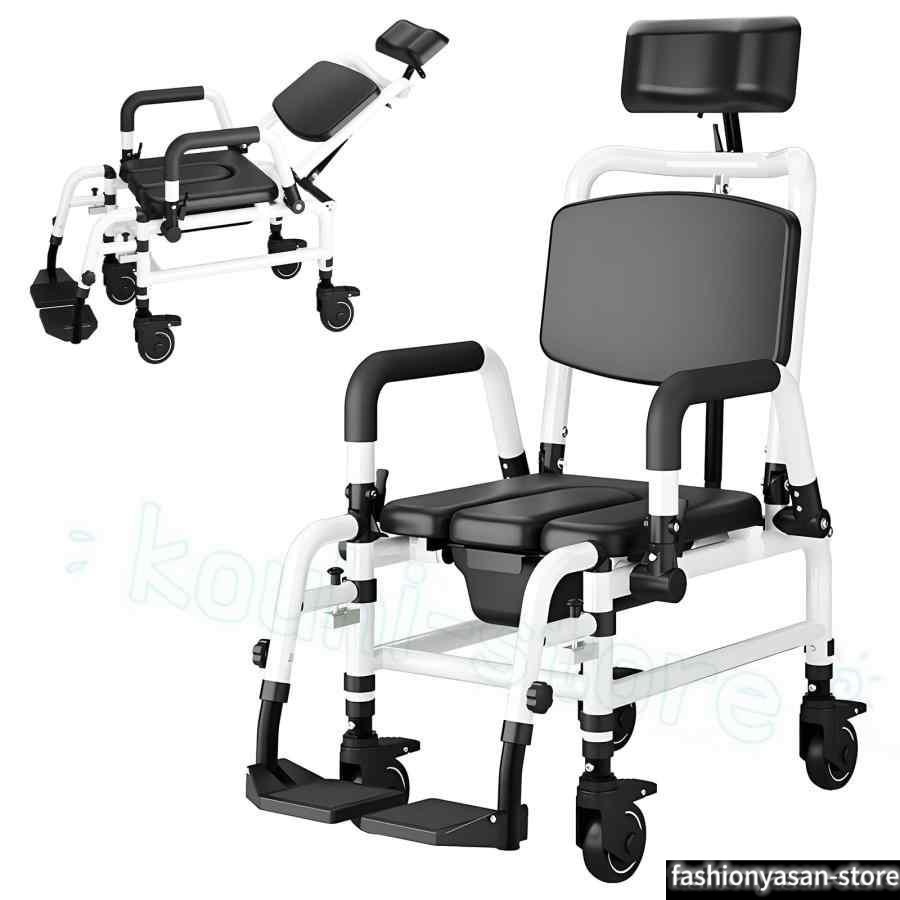 入浴用車椅子 介護用車いす、軽量アルミ製 多機能介護シャワーチェア 便器付き 背もたれ90-140°調節 キャスター付き ヘッドレスト300°回転/5段調節 シャワーキ