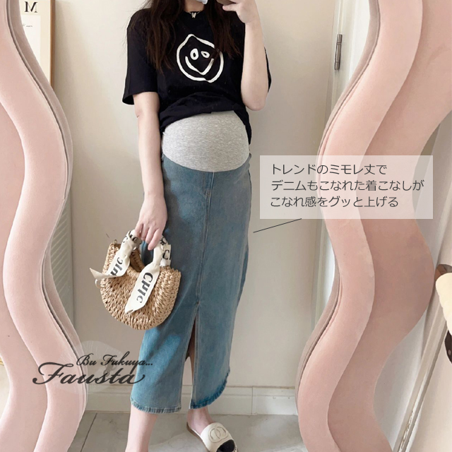 ・マタニティミモレ丈デニムスカート