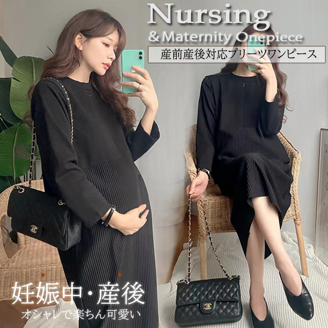授乳服 安い フォーマル お宮参り マタニティ ワンピース 冬 冠婚葬祭 プリーツ ミモレ丈 マタニティ 黒 長袖 産前産後 M175