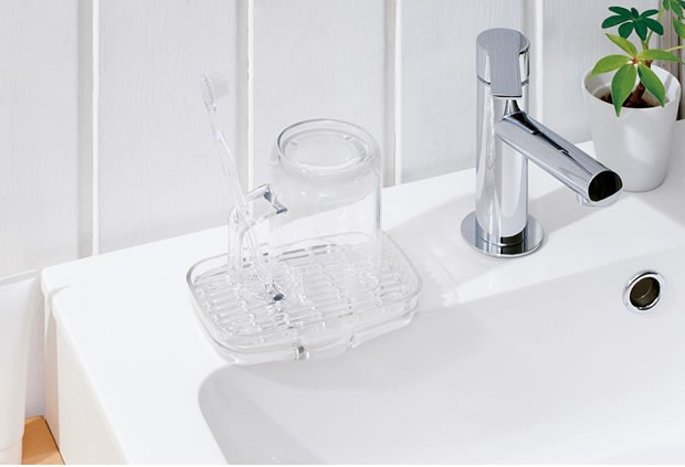 樹脂製ながら、ガラスのような美しさ。洗面室アイテムとしては嬉しい、