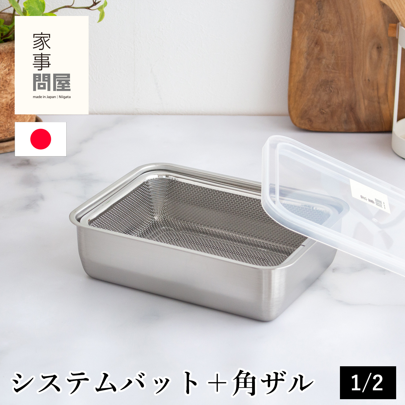 | 特徴 ・料理の下ごしらえに便利な、システムバットと下ごしらえ角ザルのセットです。システムバットの中に下ごしらえ角ザルがぴったり入り、一緒に使うとさらに便利です。 ・角型なので調理スペースを邪魔せずに使え、冷蔵庫にもすっきり収まります。 ・システムバットは蓋付きで保存もできる角型バット。真ん中サイズの1/2は、肉や魚に下味をつけたり、常備菜の保存をするのにちょうどよい大きさです。 ・下ごしらえ角ザルは、網の目が細かくしっかりした作りの角型ザル。足がついているので、シンクに直置きしても気にならず衛生的です。真ん中サイズの1/2は、ゆで野菜の水切りなどに。適度な大きさがあるのに、邪魔にならず使い勝手の良い大きさです。 | |