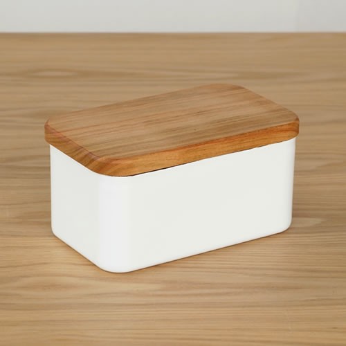 時とともに味わい深い色合いに変わる天然木。バターカット用のソーサーとしても使える木蓋琺瑯の白とのコントラストが美しい、天然木を使用した木蓋。