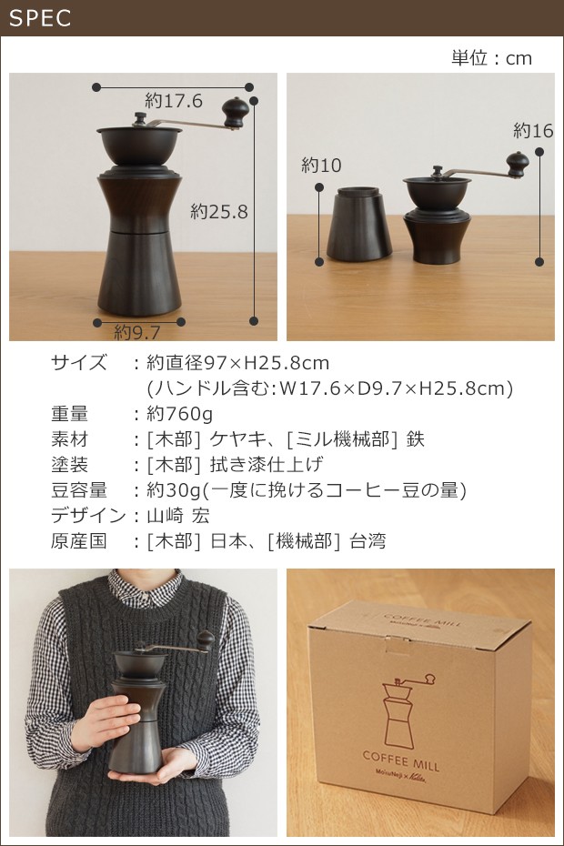 | 豆容量 | 約30g(一度に挽けるコーヒー豆の量) |