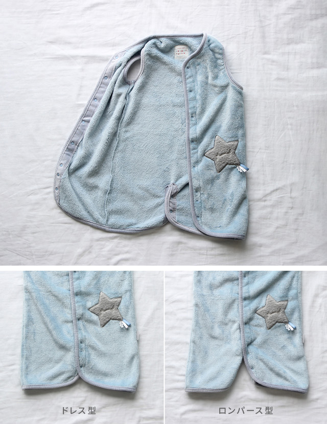 股下にはボタンが付いており、ドレス型とロンパース型になる便利な2way仕様。ボタンを留めれば、お子様が寝返りをしても朝まで捲くれる心配がありません。また、ドレス型で成長しても長く使えるのが嬉しい!