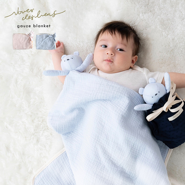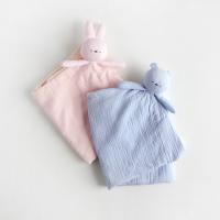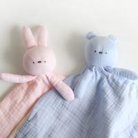 ゆるカワなくまやうさぎのぬいぐるみが付いた、ガーゼ素材のミニブランケット。