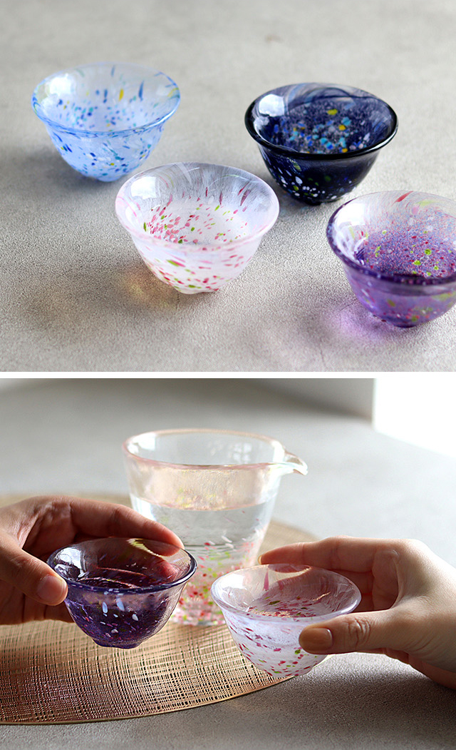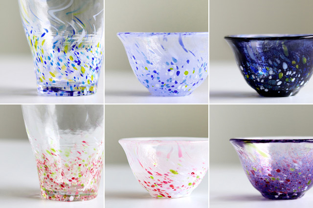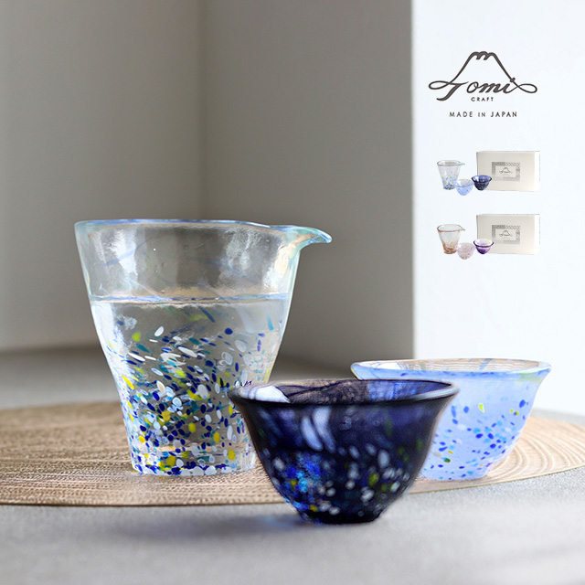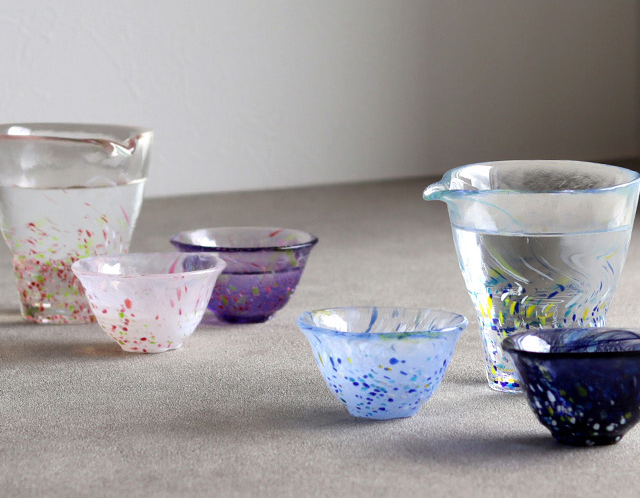 鮮やかなガラス粒と緩やかなフォルムが美しい、『Tomi CRAFT』の酒器3点セット。