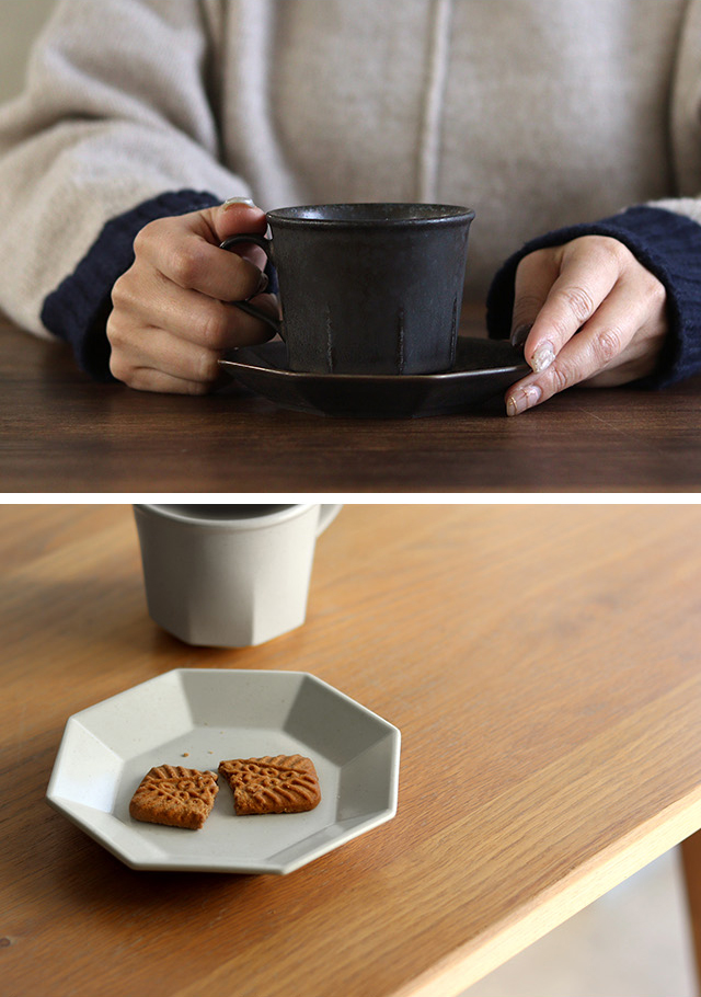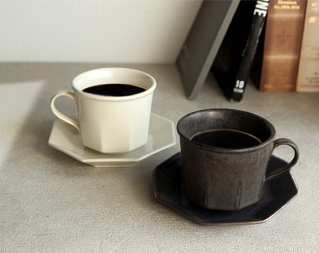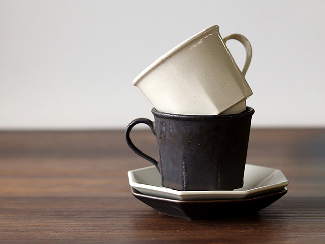 口元はフラット、ボトムは八角形のカップに、縁が反り立ったデザインのソーサー。