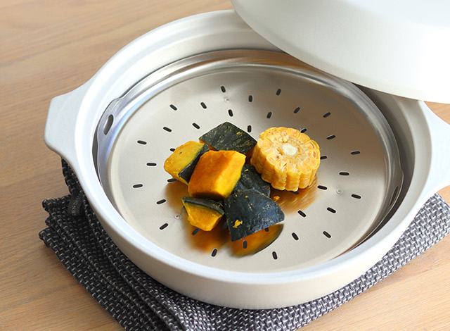 鍋に水またはお湯を1〜2cmの高さまで注ぎ、食材をのせたスチームプレートをセット。蓋をして加熱してください。