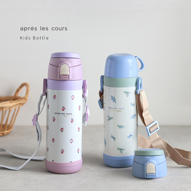 いちご柄と恐竜柄が可愛らしい子供用の水筒。