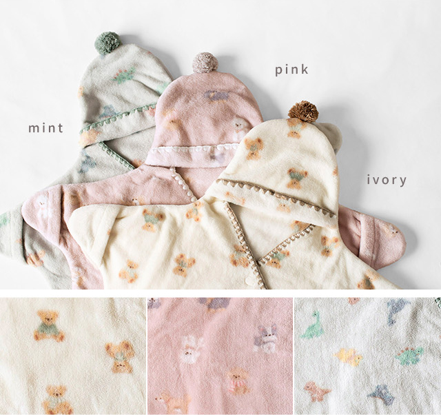 カラーは、アイボリー(テディベア)・ピンク(わんこ)・ミント(恐竜)の3種類。