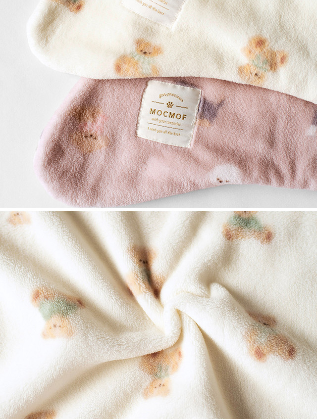 生地は、なめらかなスムースボアを使用したフリース素材。ふんわりやわらかく、思わず頬ずりしたくなるような肌ざわりです。