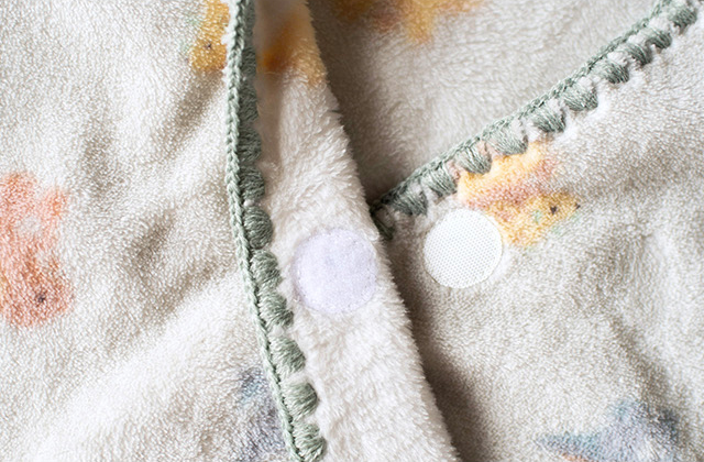 面テープ式なので、ボタンのように一つずつ留める手間がなく、パッと着せられるのが魅力。
