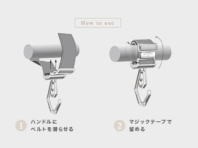 1.装着したい箇所にベルトを潜らせます。 2.隙間のないようにきっちり巻きながらベルトを重ねてしっかり押さえてとめます。