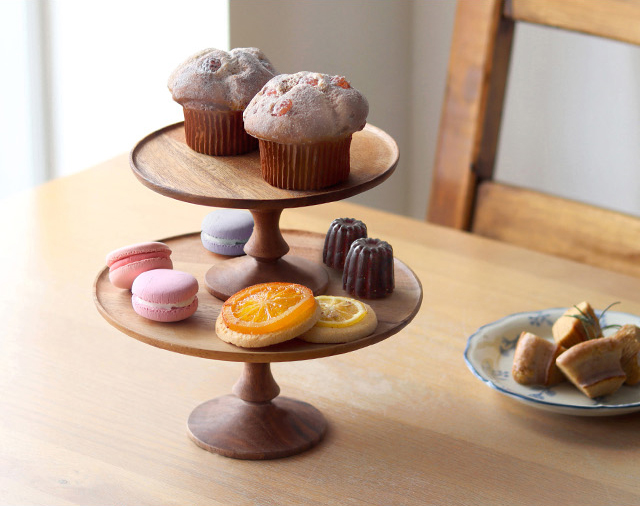 ケーキや焼き菓子が映える、アカシアウッドで作られた温かみのあるケーキスタンド(S)。