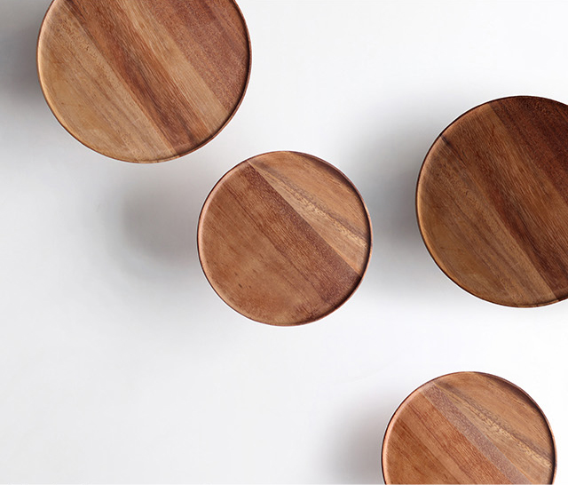 自然の木で作られたケーキスタンドは、アカシアウッドの個性的な木目が出ている一点もの。一つとして、同じ物はありません。