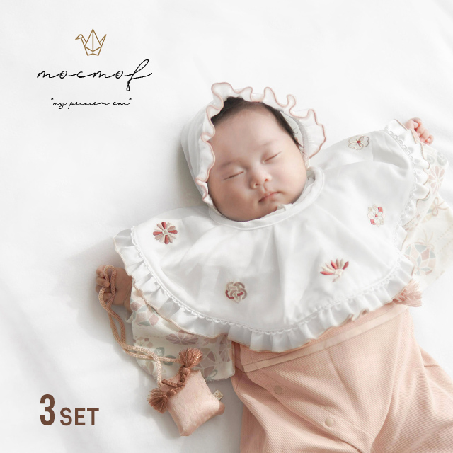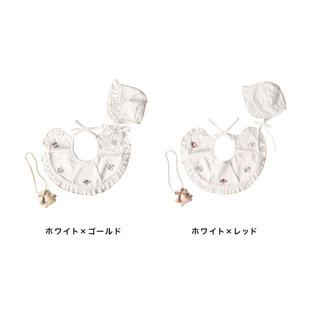 お子さまの特別な1日を贅沢に彩る、スタイ&ボンネット&おまもり飾りの3点セットです。
